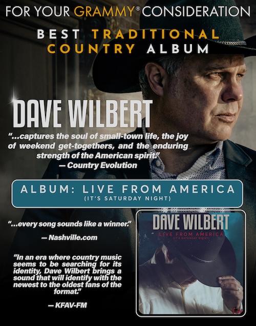 NASHVILLE, Tenn. (October 09, 2024) – Country singer-songwriter and independent recording artist Dave Wilbert announces that his latest album, Live From America (It’s Saturday Night), has been admitted for consideration in the first round of voting for the 68th Annual GRAMMY® Awards. The project is on the ballot for Best Traditional Country Album category.