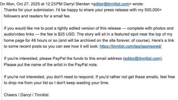 Yet, these ponzi schemers are still trying to swindle anywhere from as little as $20 to more than $1000+ to employ their so-called skills of journalism or media broadcasting. Most often the case being an artist who is still in the midst of the paying their dues phase of their music career, and just don’t know better, yet. And unless that artist employs someone such as myself, a certain number of these artists will inevitably fall victim to these ponzi schemes.