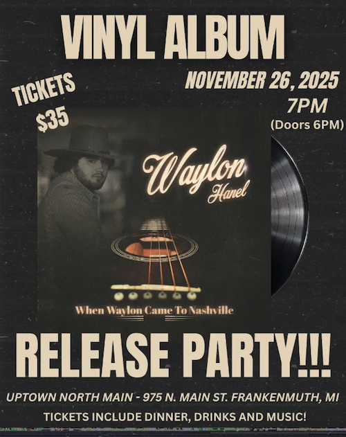 NASHVILLE, Tenn. (October 15, 2025) — Country singer-songwriter and independent recording artist Waylon Hanel announces his 3rd studio album entitled When Waylon Came To Nashville [Pre-save/Pre-add], available everywhere digitally on Friday, November 28 by CDX Records. A limited supply of vinyl will also be available while supplies last during his annual hometown album release party, scheduled for Wednesday, November 26, 7pm at Uptown North (975 N. Main St. Frankenmuth, Mich.). The album marks Hanel’s first wax pressing of his music, with the Nov. 26 release party event expecting to sell out. Tickets are available now at [info/tickets].